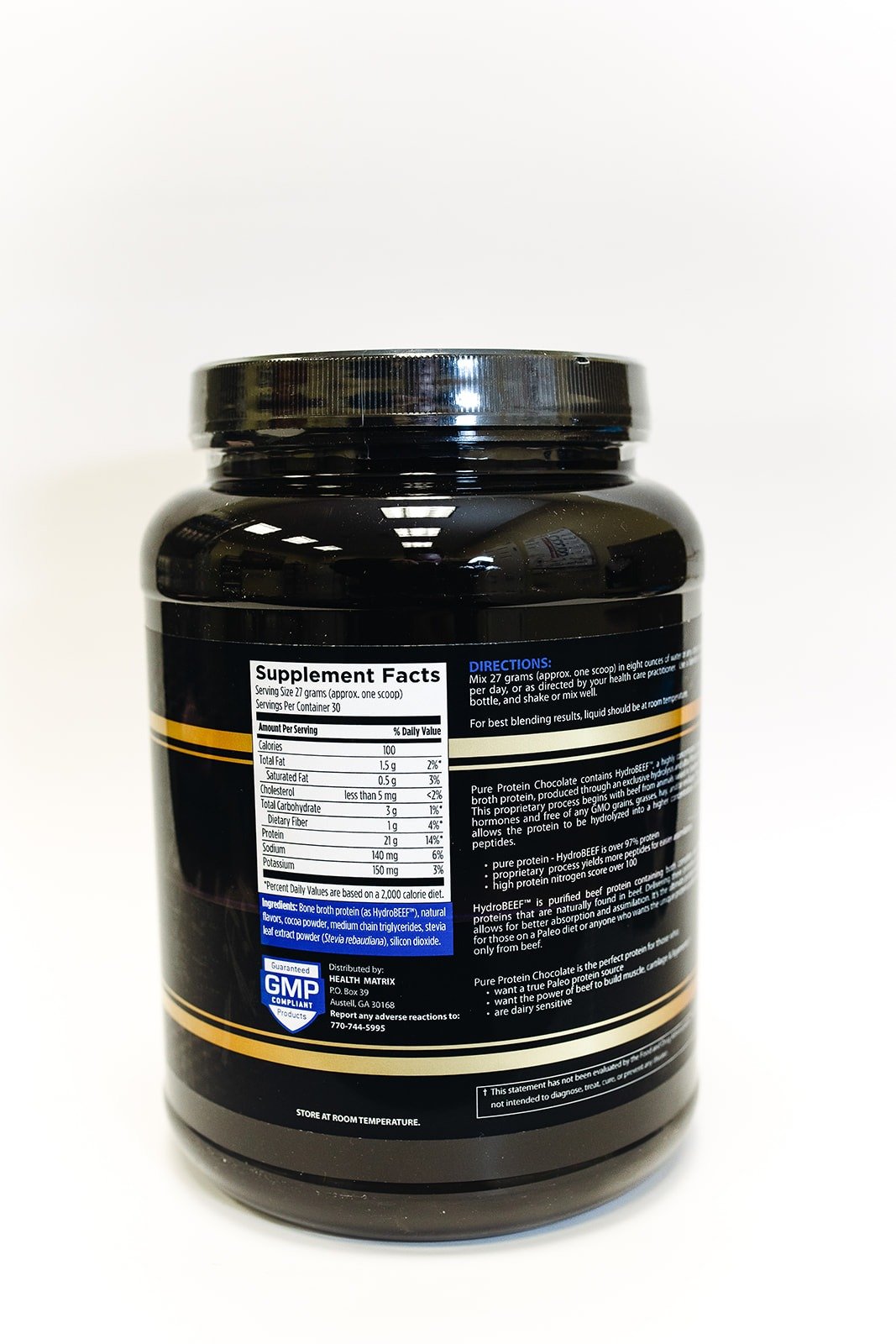 Pure Protein is a novel, great-tasting, dairy-free protein powder, yielding 21 grams of protein per serving. It contains HydroBEEF™, a highly concentrated, bone broth protein isolate, produced through an exclusive proprietary process that allows the protein to be hydrolyzed into more peptides, resulting in easier absorption and assimilation. This product contains beef from animals raised in Sweden without hormones or antibiotics, and is free of any GMO grains, grasses, and/or ensilage.
